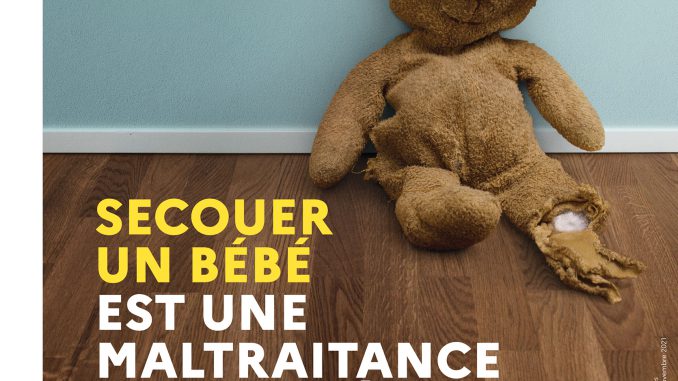 Pour sa part, la campagne d’information du Gouvernement, qui comprend une vidéo choc, a été lancée symboliquement par Adrien Taquet au CHRU de Lille, appuyant ainsi les travaux du docteur Vinchon et de l’association Les Maux – Les Mots pour le dire. Adoptant le slogan « Secouer un bébé est une maltraitance qui peut être mortelle », la campagne vise à ancrer dans les esprits que le SBS est une violence volontaire et répétée.